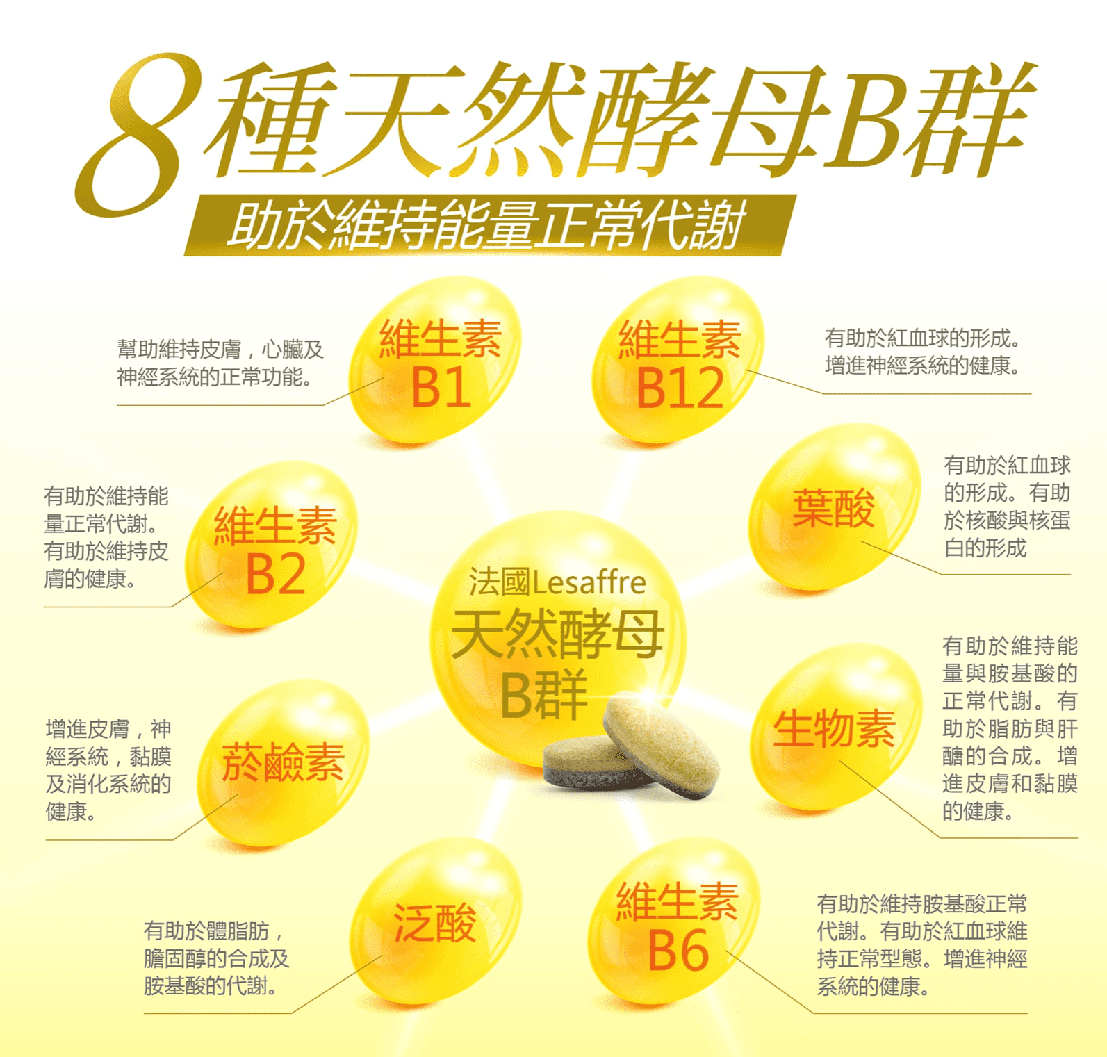 消費者常聽到的B群,又稱為維生素B群或是維他命B群,包含了B1、B2、B3(菸鹼素)、B5(泛酸)、B6、B7(生物素)、B9(葉酸)、B12等八種維生素,是人體可以從食物來源獲得的一種水溶性維生素。