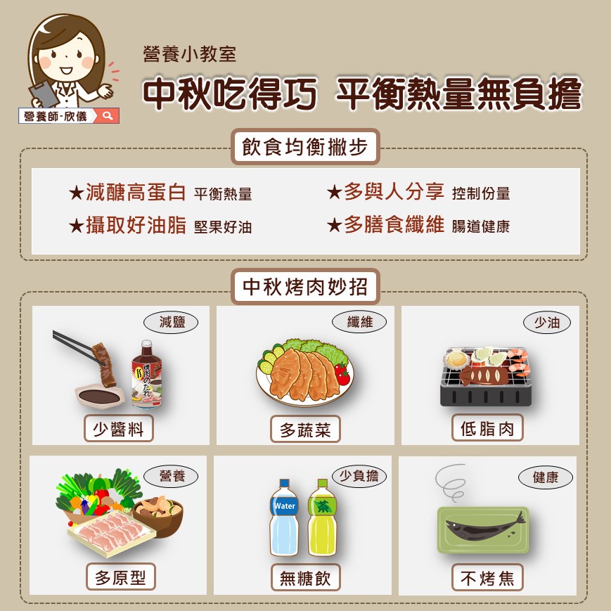 中秋佳節團聚時不免吃大餐,如何才能吃得健康又少負擔?資深營養師廖欣儀提醒,大家可以學會以下幾點飲食均衡小撇步,讓你享受美食又甭擔心圓了肚皮: