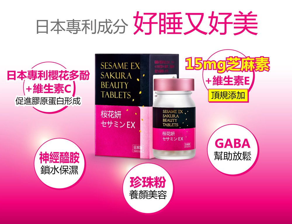 現代人工作壓力大、思緒繁雜,夜晚入睡困難是許多人的困擾,健康力枕無憂EX 芝麻櫻花錠添加3倍滿量芝麻素,成分取自黑芝麻,並加入幫助放鬆的GABA,讓睡眠品質再進化;日本製造櫻花多酚,協助夜間美麗修復,擺脫睡眠失調的暗沉氣色,還原澎潤水嫩好光采,讓你一夜好眠,一早好美!