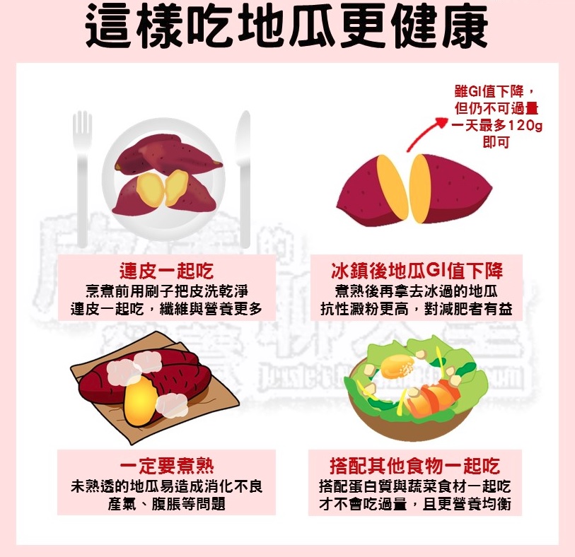 雖然地瓜屬於低GI食物,比較不會引起飯後血糖變化,但吃多了等於攝取過多的碳水化合物,仍會讓血糖快速上升,糖尿病患者應特別留意。