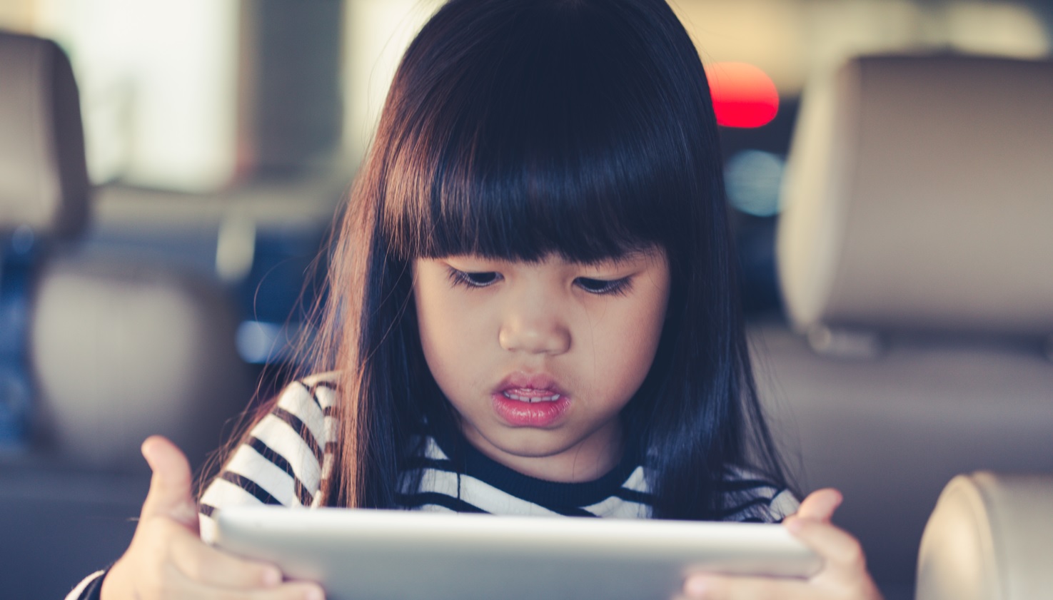 ▲小朋友眼睛盯著平板的小螢幕,身體往前傾並伸長脖子,很容易產生「烏龜頸」。
