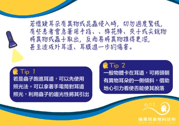 榛果耳鼻喉科診所提醒,當耳朵有異物或昆蟲侵入時,千萬要保持冷靜,不要急著用手指、棉花棒、夾子或尖銳物將異物或蟲子取出,這麼做容易將異物推得更深,甚至造成外耳道、耳膜進一步的傷害,如果無法取出異物,應立即就診請耳鼻喉科醫師處理。