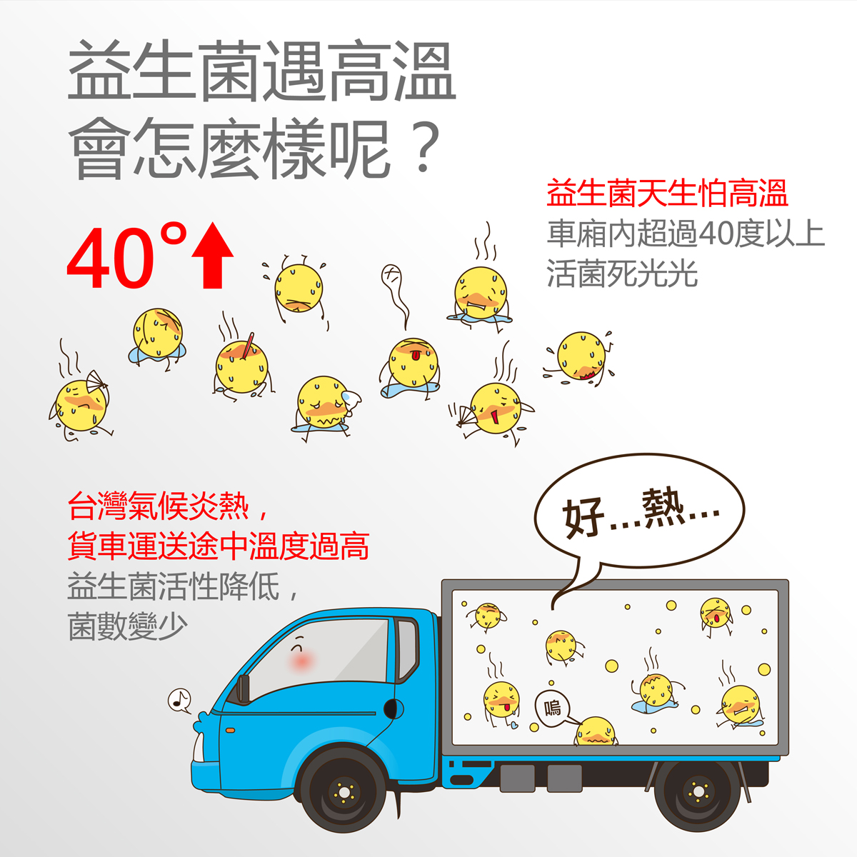 廖欣儀指出,益生菌不耐高溫,雖然目前經特殊技術處理的益生菌,號稱可耐70度,但超過40度以上的環境若沒有馬上「消暑」,可能會有熱衰竭的生命危險,台灣夏季炎熱,物流車內經常飆高到40~50度,冷藏配送有助維持益菌活性。