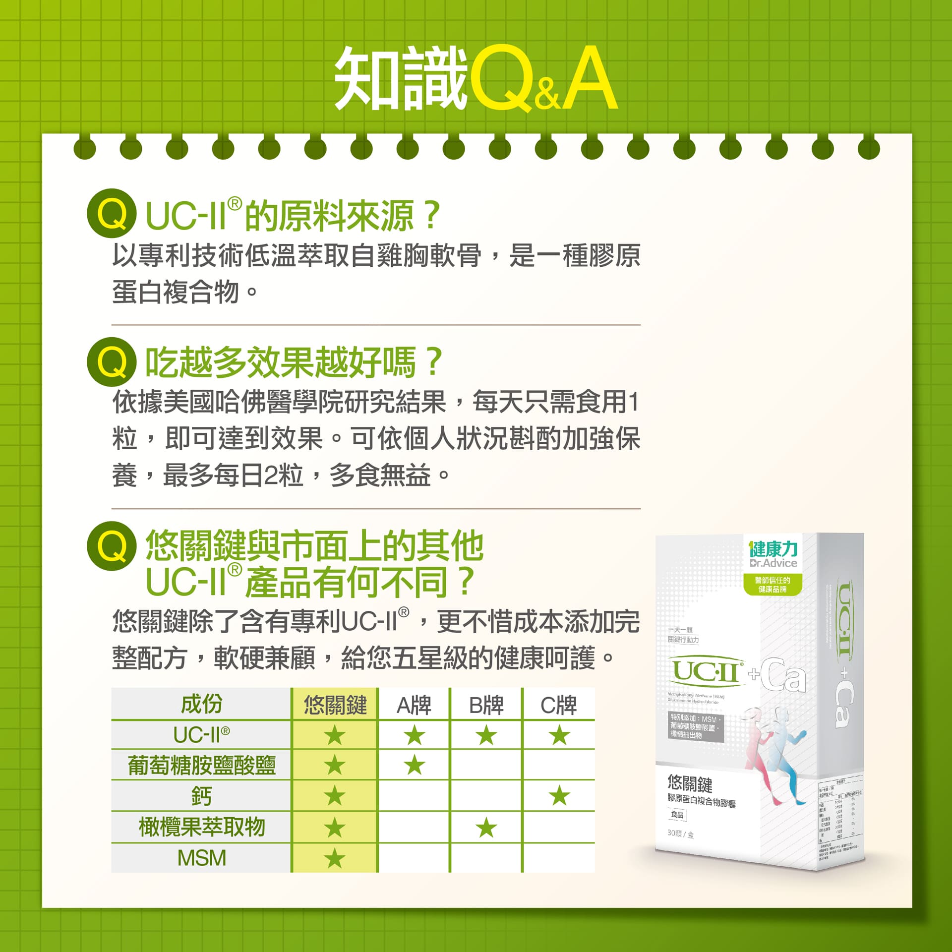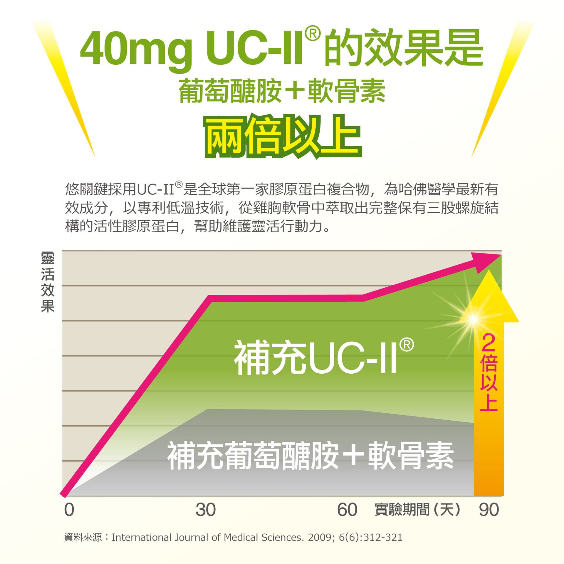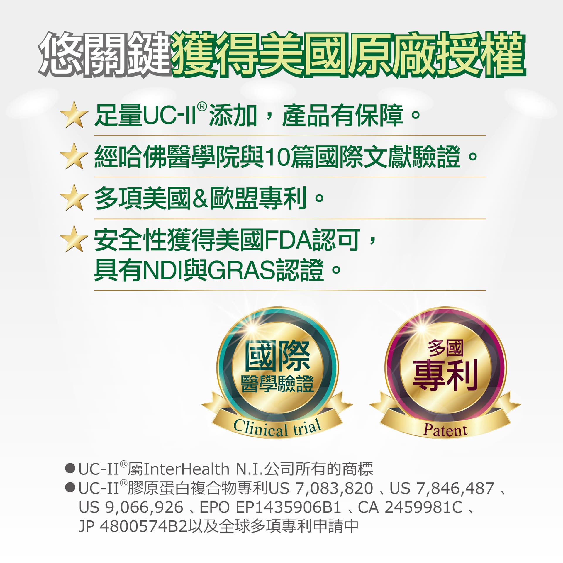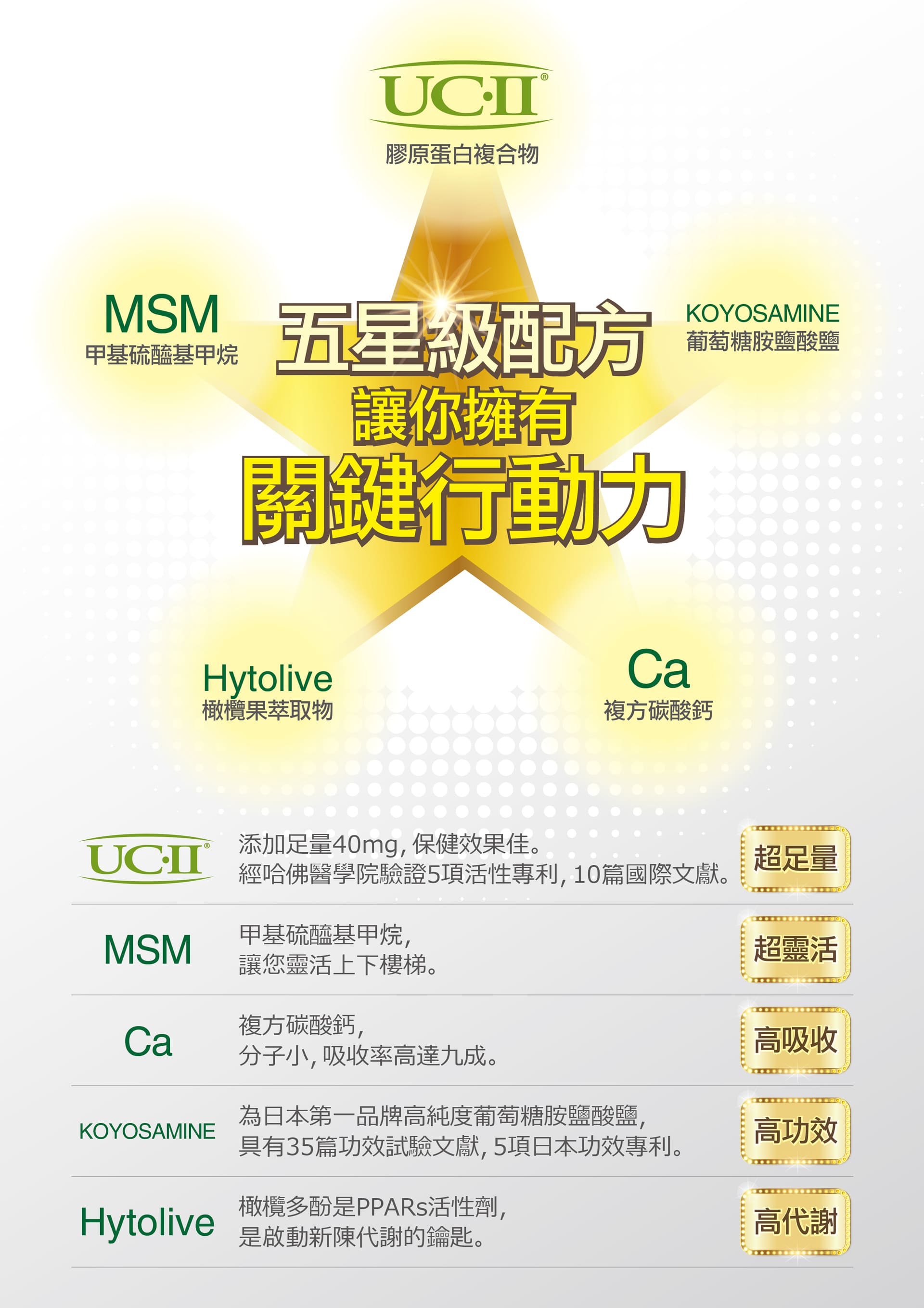 玉米來源可溶性纖維、複方碳酸鈣(碳酸鈣、糊精、阿拉伯膠) 、甲基硫醯基甲烷〔MSM〕、葡萄糖胺鹽酸鹽、膠原蛋白複合物(雞胸軟骨粉、氯化鉀)、橄欖果萃取物(麥芽糊精、橄欖油抽出物、二氧化矽);膠囊成份:明膠、二氧化鈦、甘油、硫酸月桂酯納、食用紅色六號、食用黃色四號、食用藍色一號、純水;UC-II®膠原蛋白複合物(含非變性二型膠原蛋白) 每份添加量40mg;UC-II®字樣及商標圖示屬InterHealth N.I.公司所有的商標;UC-II®膠原蛋白複合物專利US 7,083,820、US 7,846,487、US 9,066,926、EPO EP1435906B1、CA 2459981C、JP 4800574B2以及全球多項專利申請中。作用