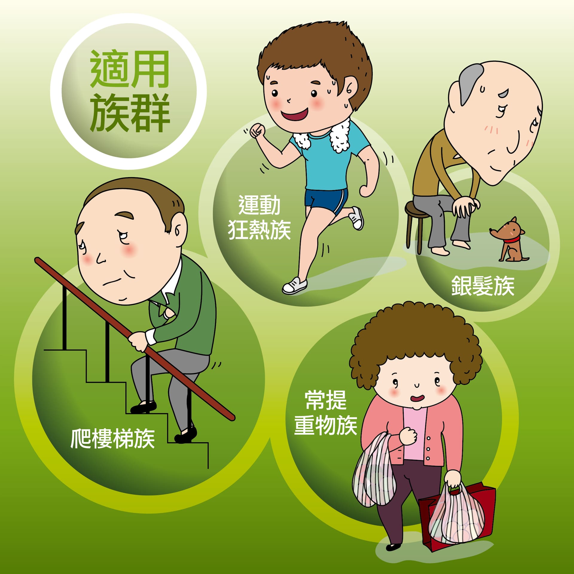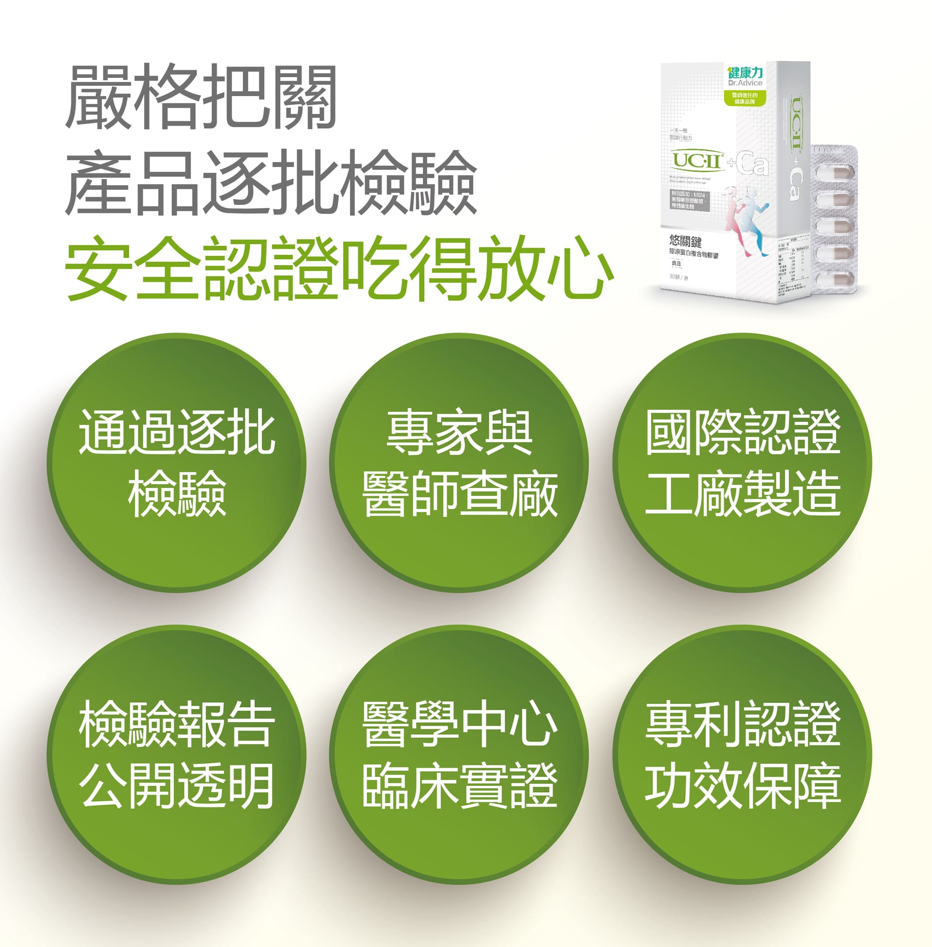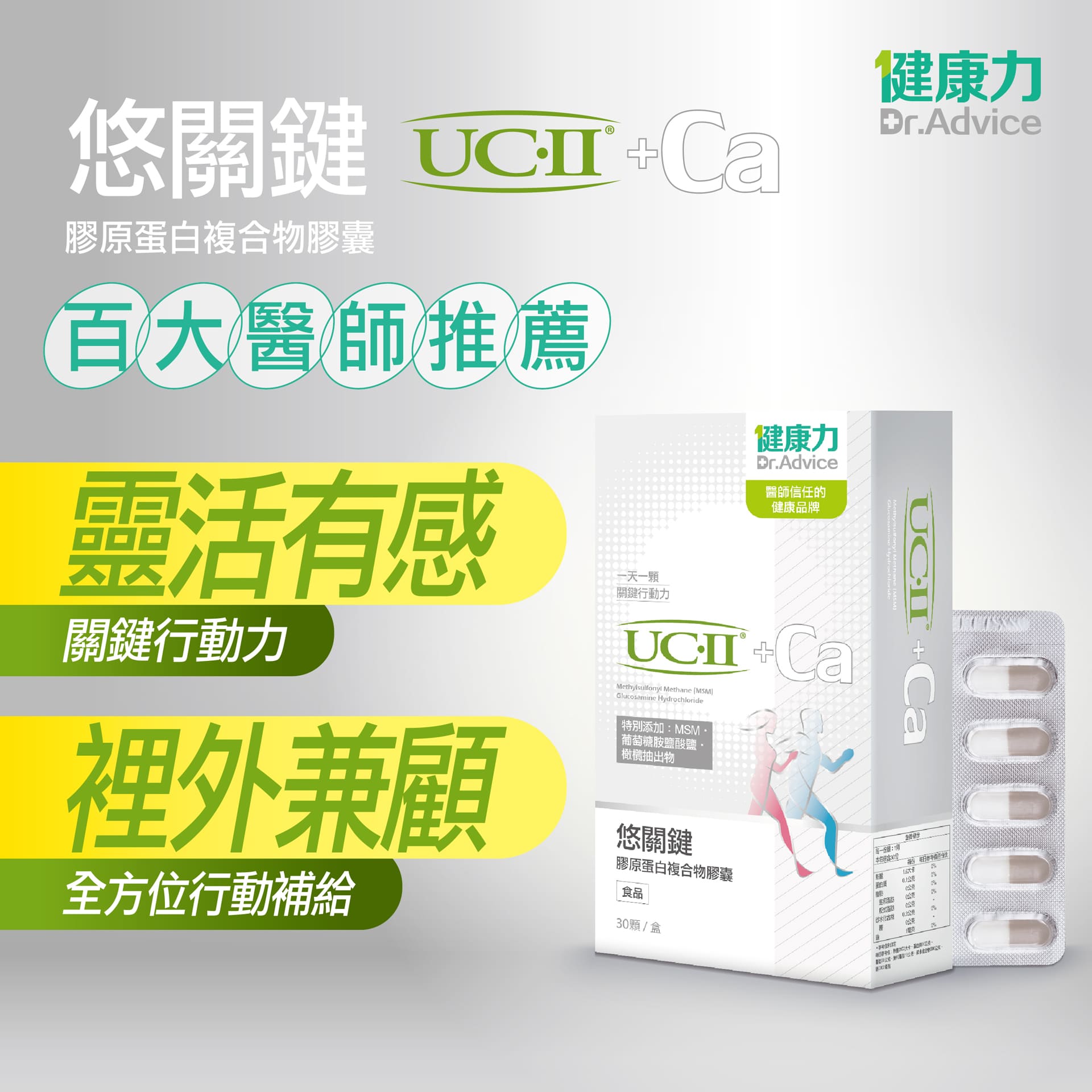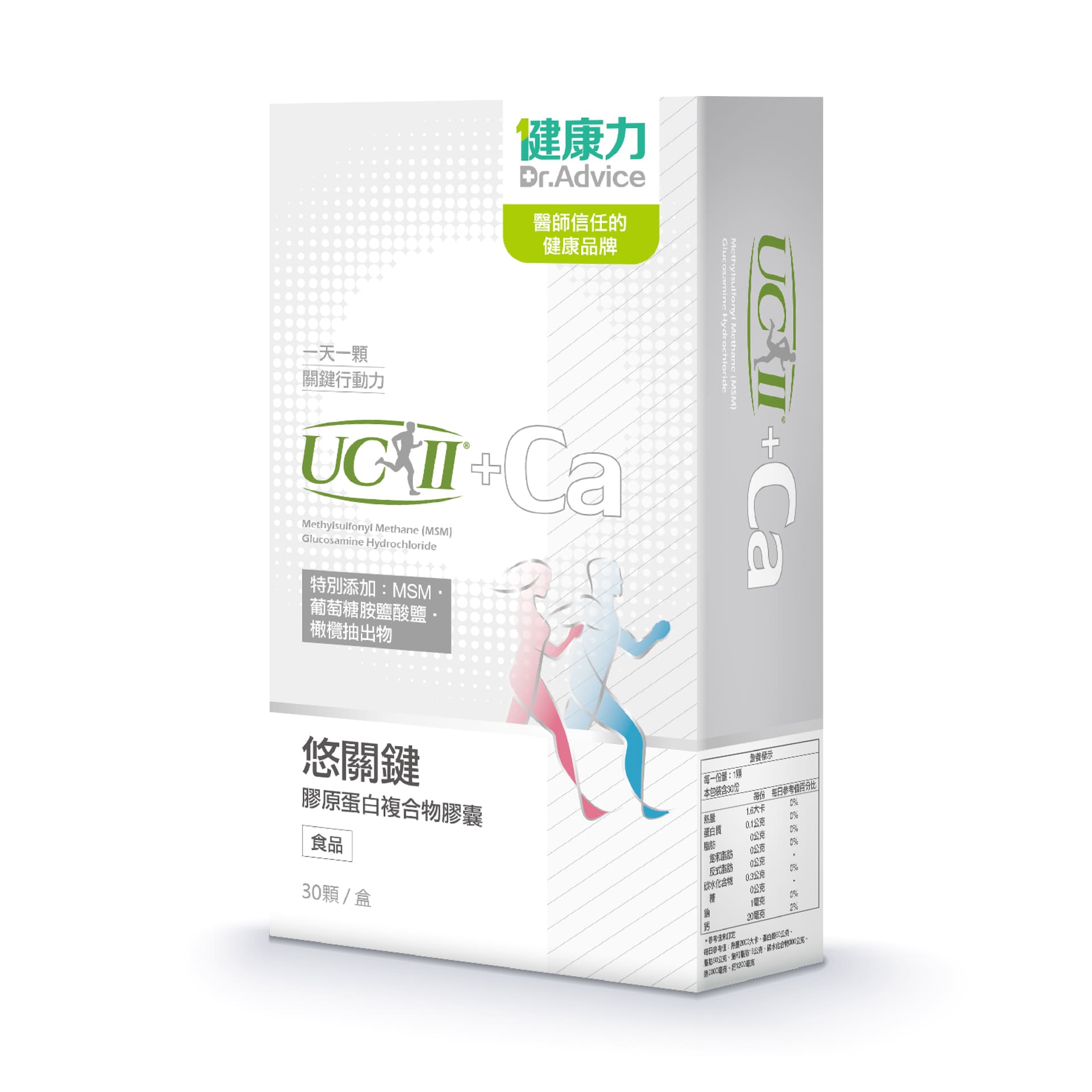 玉米來源可溶性纖維、複方碳酸鈣(碳酸鈣、糊精、阿拉伯膠) 、甲基硫醯基甲烷〔MSM〕、葡萄糖胺鹽酸鹽、膠原蛋白複合物(雞胸軟骨粉、氯化鉀)、橄欖果萃取物(麥芽糊精、橄欖油抽出物、二氧化矽);膠囊成份:明膠、二氧化鈦、甘油、硫酸月桂酯納、食用紅色六號、食用黃色四號、食用藍色一號、純水;UC-II®膠原蛋白複合物(含非變性二型膠原蛋白) 每份添加量40mg;UC-II®字樣及商標圖示屬InterHealth N.I.公司所有的商標;UC-II®膠原蛋白複合物專利US 7,083,820、US 7,846,487、US 9,066,926、EPO EP1435906B1、CA 2459981C、JP 4800574B2以及全球多項專利申請中。作用