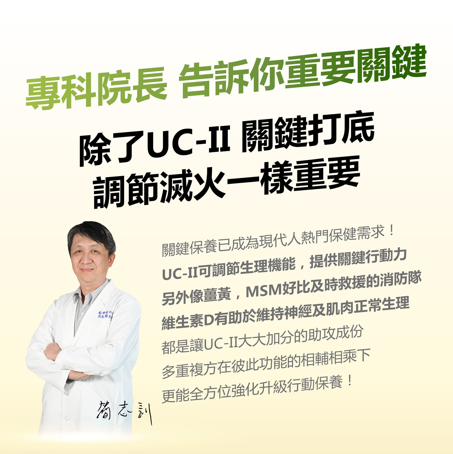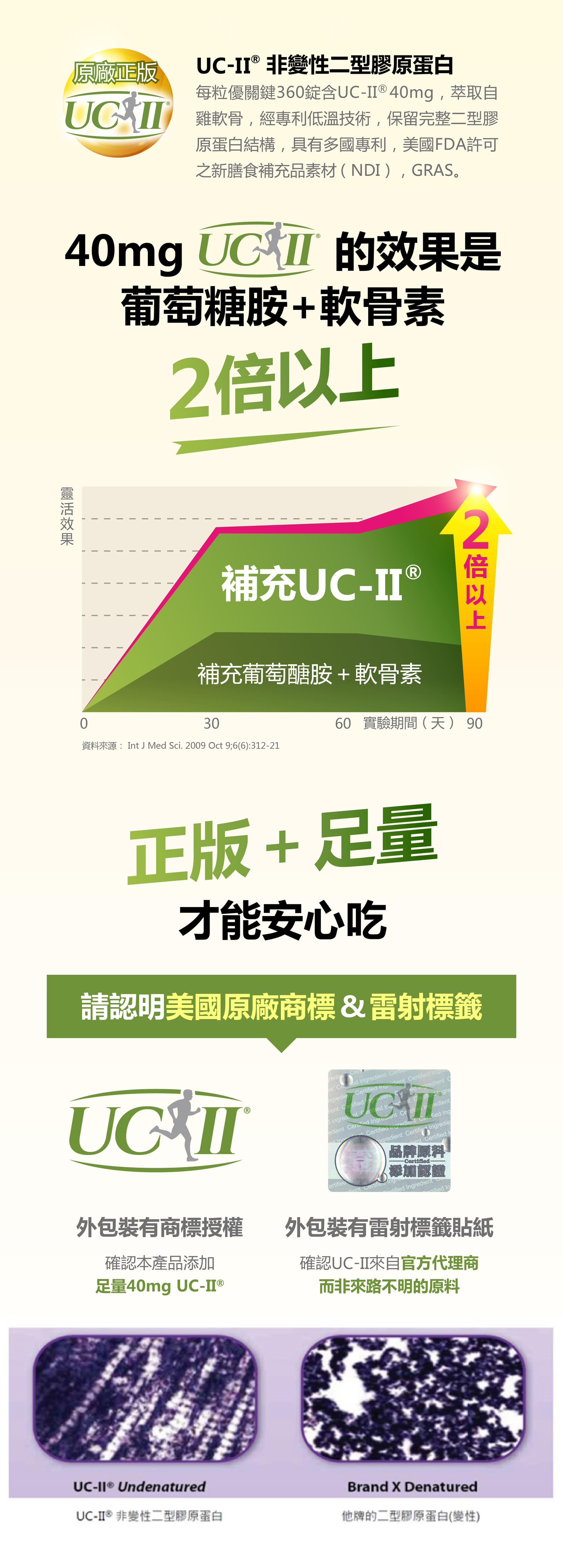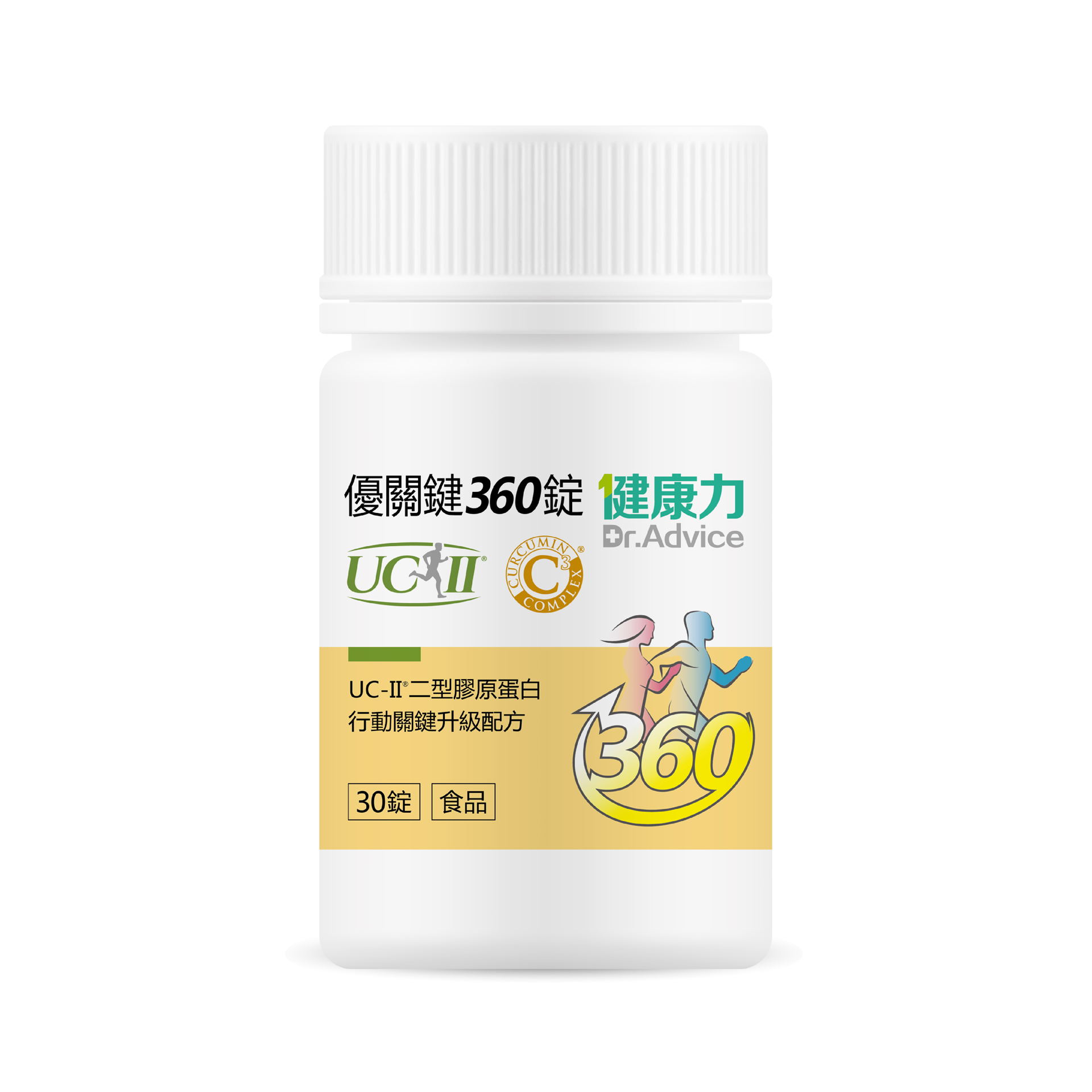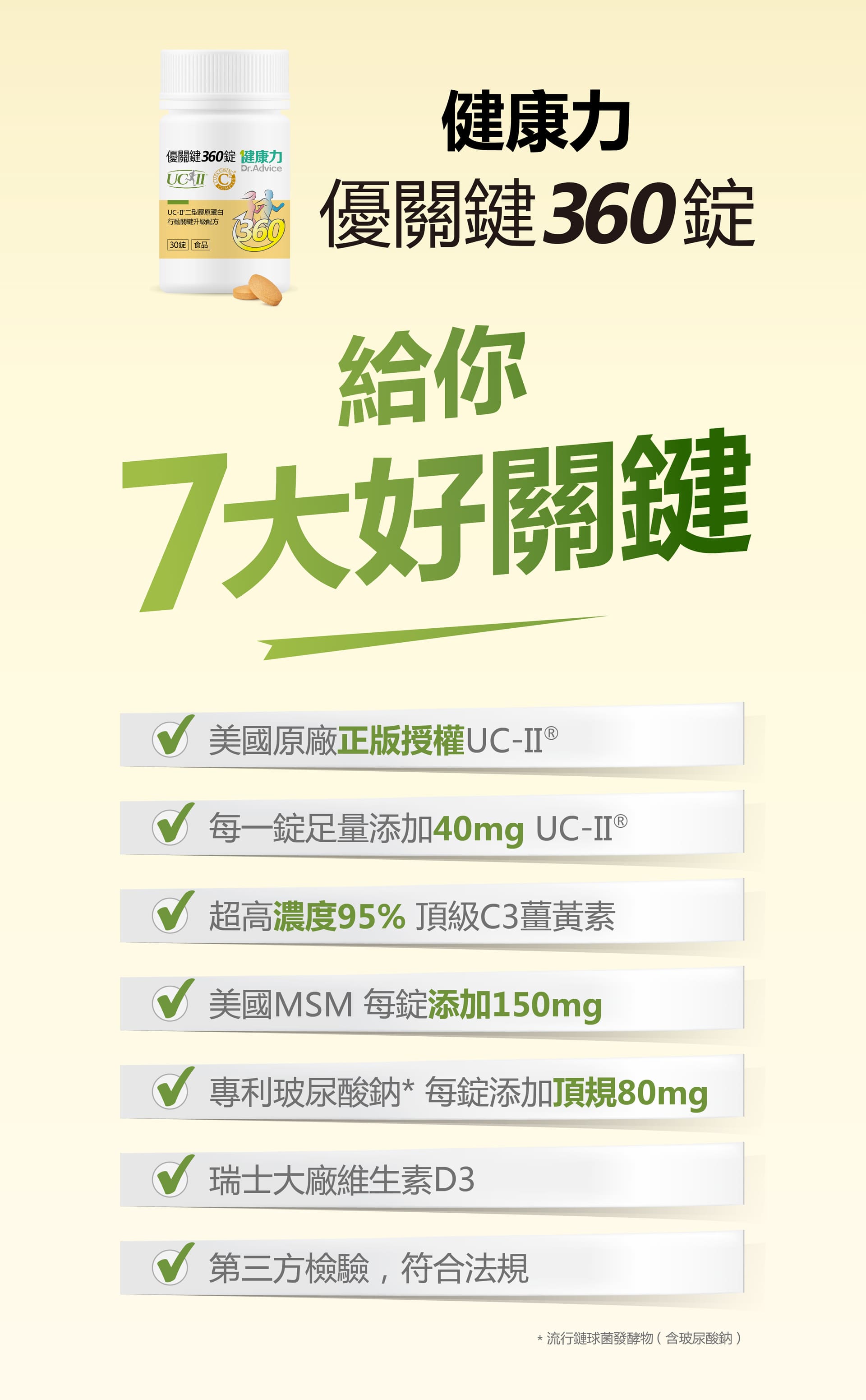 微結晶狀α-纖維素、甲基硫醯基甲烷(甲基硫醯基甲烷、二氧化矽)、薑黃抽出物、流行鏈球菌發酵物(含透明質酸鈉)、UC-II®膠原蛋白複合物【雞胸軟骨(含二型膠原蛋白)、氯化鉀】、硬脂酸鎂、維生素D3【修飾澱粉(辛烯基丁二酸鈉澱粉)、蔗糖、抗壞血酸鈉(維生素C)(抗氧化劑)、中鏈三酸甘油酯、二氧化矽、維生素E(抗氧化劑)、膽鈣化醇(維生素D3)】、二氧化矽。膜衣成分:白色水性膜衣(聚乙烯醇、滑石粉、二氧化鈦、脂肪酸甘油脂、硫酸月桂酯鈉)、食用黃色四號鋁麗基、食用黃色五號鋁麗基、二氧化鈦。作用