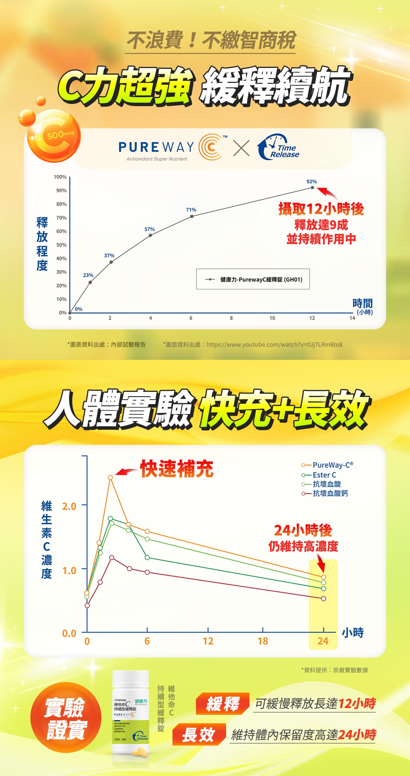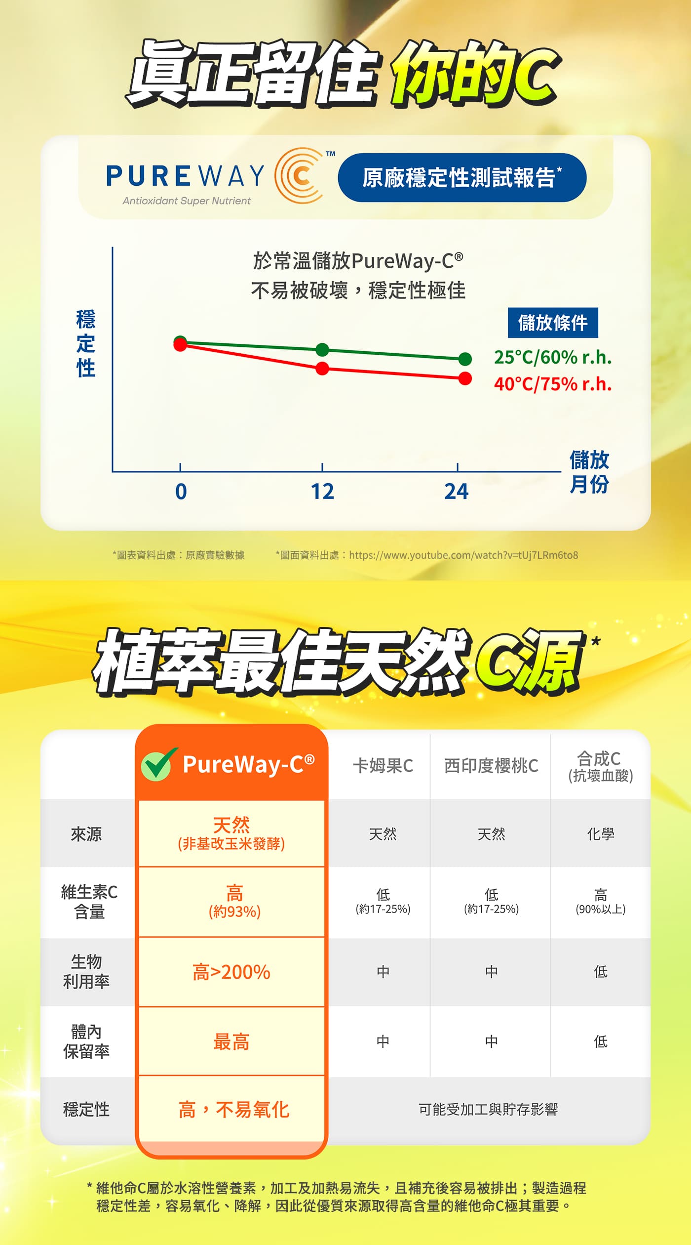 PUREWAY-C®複方維生素C【抗壞血酸(維生素C)、柑橘萃取物、米糠粉】、羥丙基甲基纖維素、微結晶狀α-纖維素、聚乙烯吡咯烷酮、白色水性膜衣(聚乙烯醇、滑石粉、二氧化鈦、脂肪酸甘油酯、硫酸月桂酯鈉)、硬脂酸鎂、二氧化矽、食用黃色四號鋁麗基、二氧化鈦、食用黃色五號鋁麗基