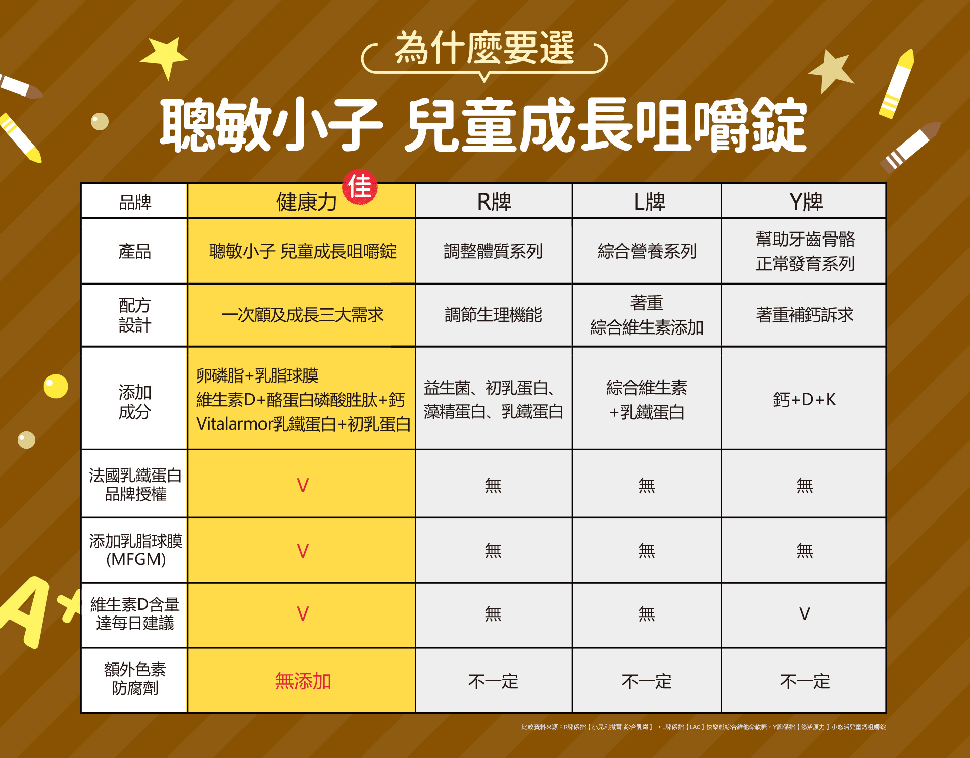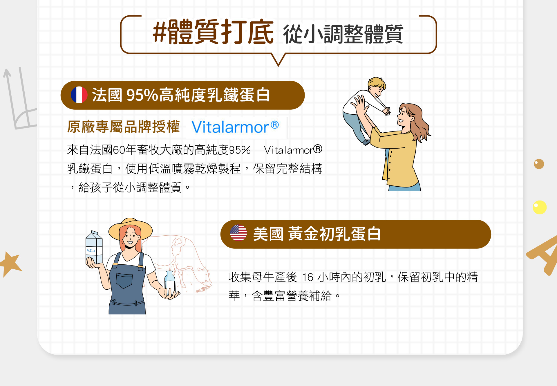 D-山梨醇、碳酸鈣、D-甘露醇(甜味劑)、可可粉(可可粉、碳酸鉀)、濃縮乳清蛋白(含鞘磷脂)、酪蛋白水解物、硬脂酸鎂、乳鐵蛋白、磷脂醯絲胺酸【卵磷脂〈含磷脂醯絲胺酸〉、二氧化矽】、初乳粉【牛初乳、牛奶蛋白濃縮物、脫脂奶粉、中鏈三酸甘油酯、卵磷脂〈來源:葵花籽〉、天然香料】、膽鈣化醇〈維生素D3〉【辛烯基丁二酸鈉澱粉、蔗糖、L-抗壞血酸鈉〈抗氧化劑〉、中鏈三酸甘油酯、二氧化矽、生育醇〈維生素 E〉〈抗氧化劑〉、膽鈣化醇〈維生素D3〉】作用