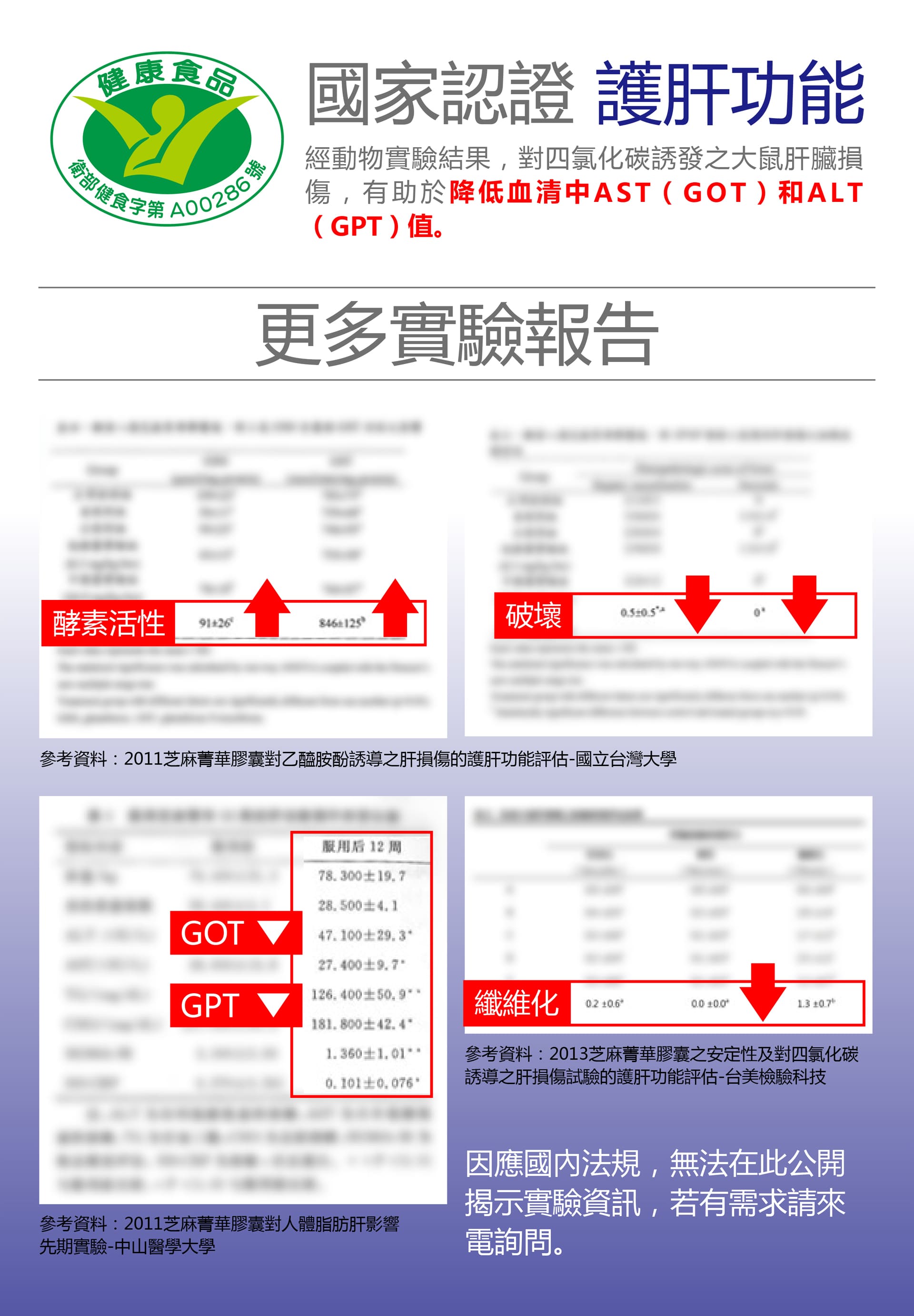 護肝功效(健康食品認證),幫助入睡,保持好氣色好心情。每1顆含芝麻素37.6~56.4毫克,為市售稀有高含量產品。產品容量